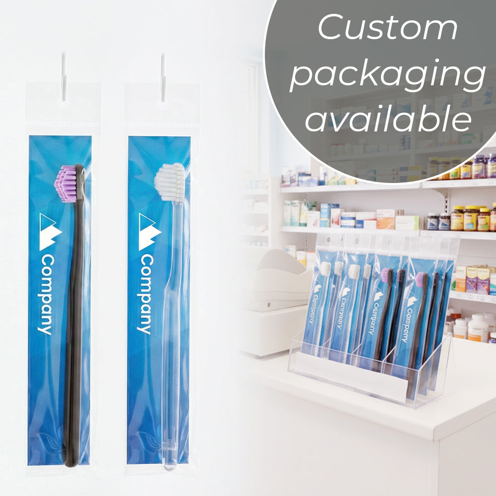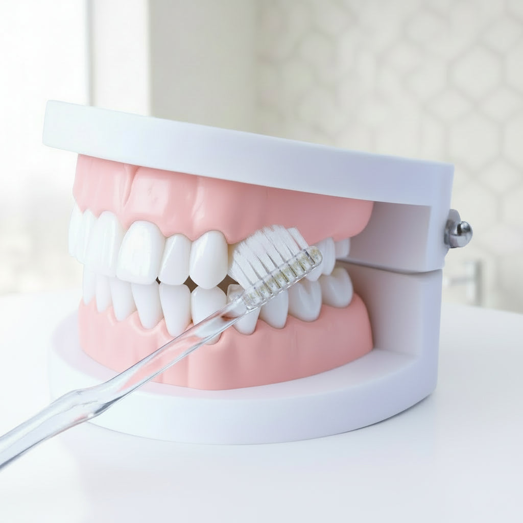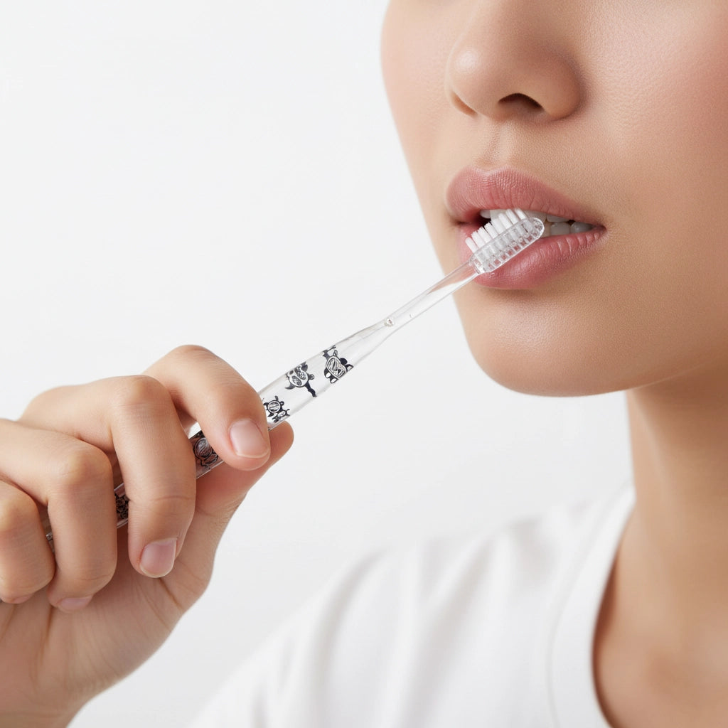 Hold the toothbrush as lightly as you would hold a pencil. Gentle strokes allow the fine bristles to reach between the teeth and into periodontal pockets. Avoid pressing too hard — excessive force bends the bristles and reduces their effectiveness.